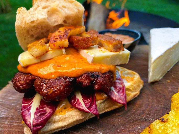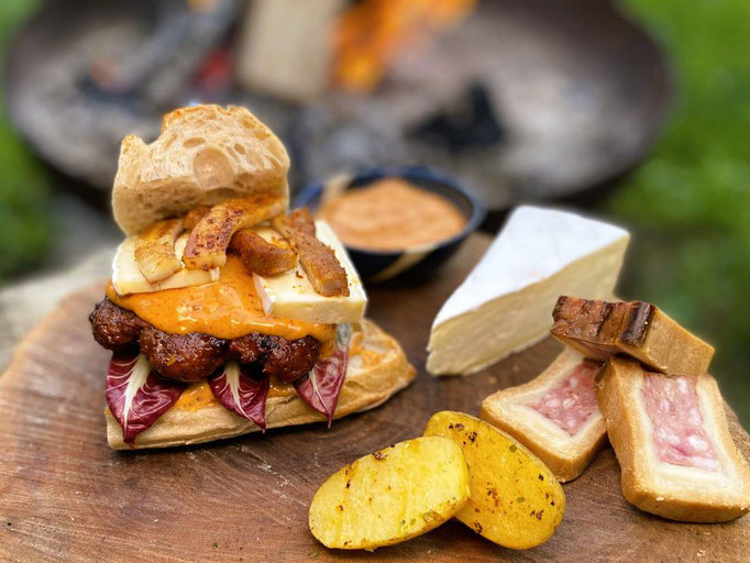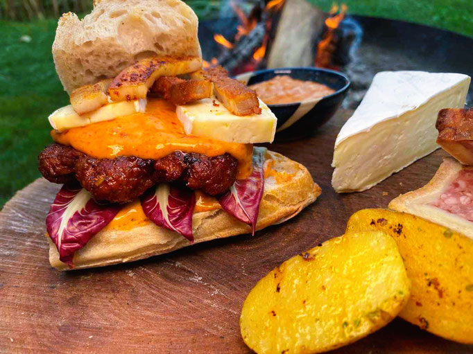 Le petit France vereint in einem Baguette als Burger. Herzhafte Merquezmasse, deftige Chipotle Sauce, feiner Camembert. Das ganze eingebettet in einem knusprigen Baguette.