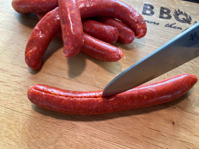 Merguez mit Messer einschneiden und den Haut/ Darm entfernen.